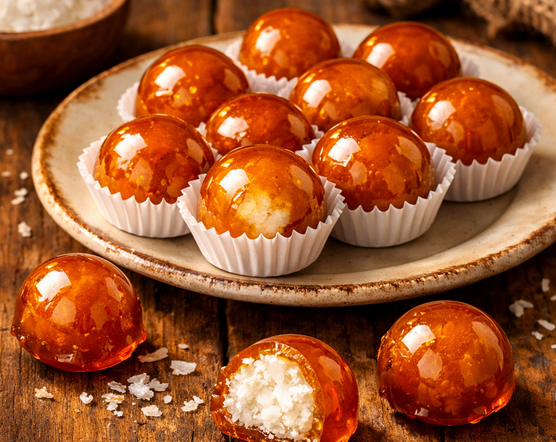 É um doce feito com uma base de coco e açúcar, parecido com um recheio de cocada cremosa, envolvido por uma casquinha dura de açúcar caramelizado por fora. Essa combinação cria um contraste delicioso: crocante por fora e macio por dentro.